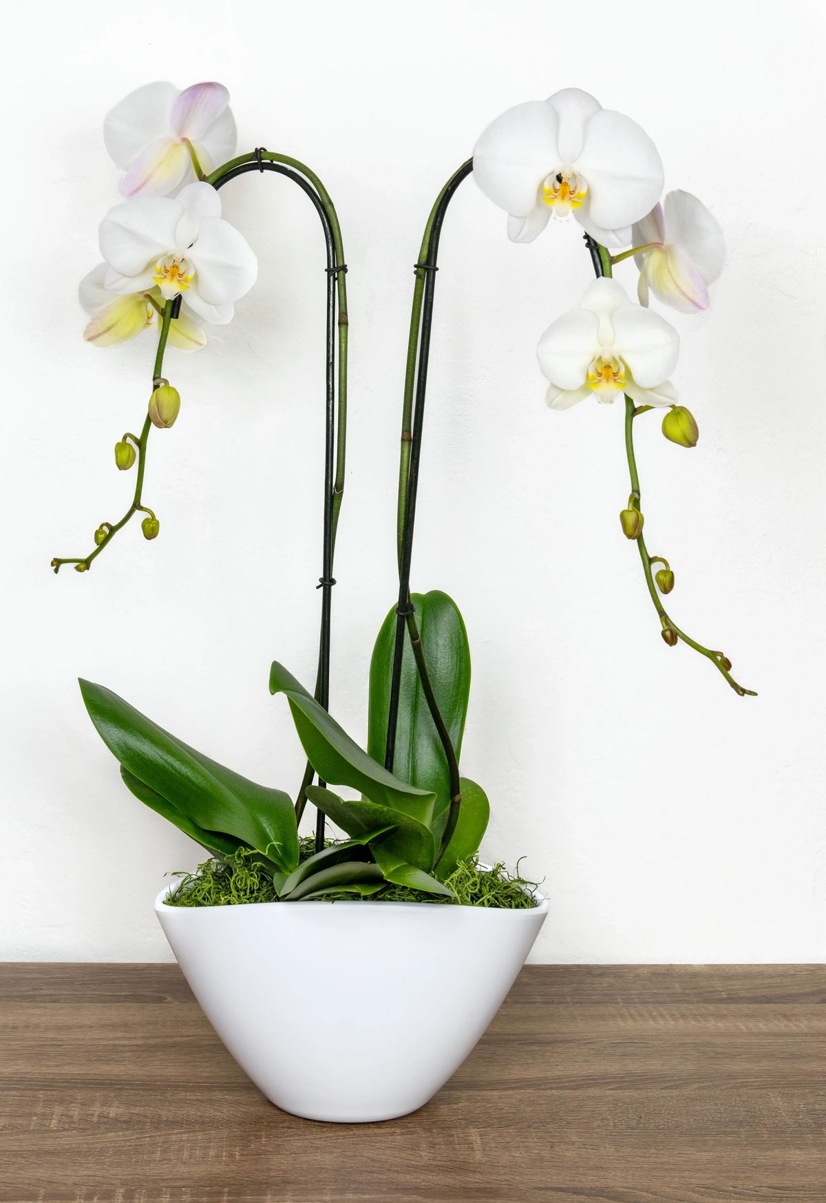 Two natural white phalaenopsis orchid plants in a white ceramic vase, with additional decorative dried moss, and dried wood accents. The unique dried accents of this arrangement enhance the natural colors of the plant, a simple and classic design perfect for any occasion.