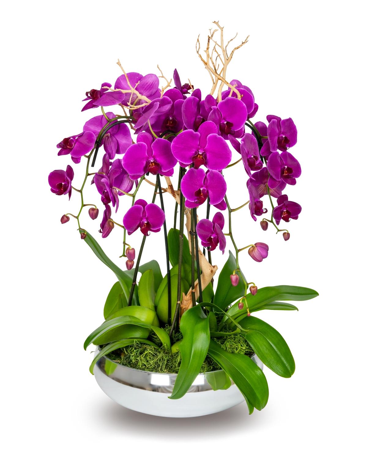 Five natural purple phalaenopsis orchid plant in a glass vase, with additional decorative dried moss, and dried wood accents. The unique dried accents of this arrangement enhance the natural colors of the plant, a premium design perfect for any occasion.