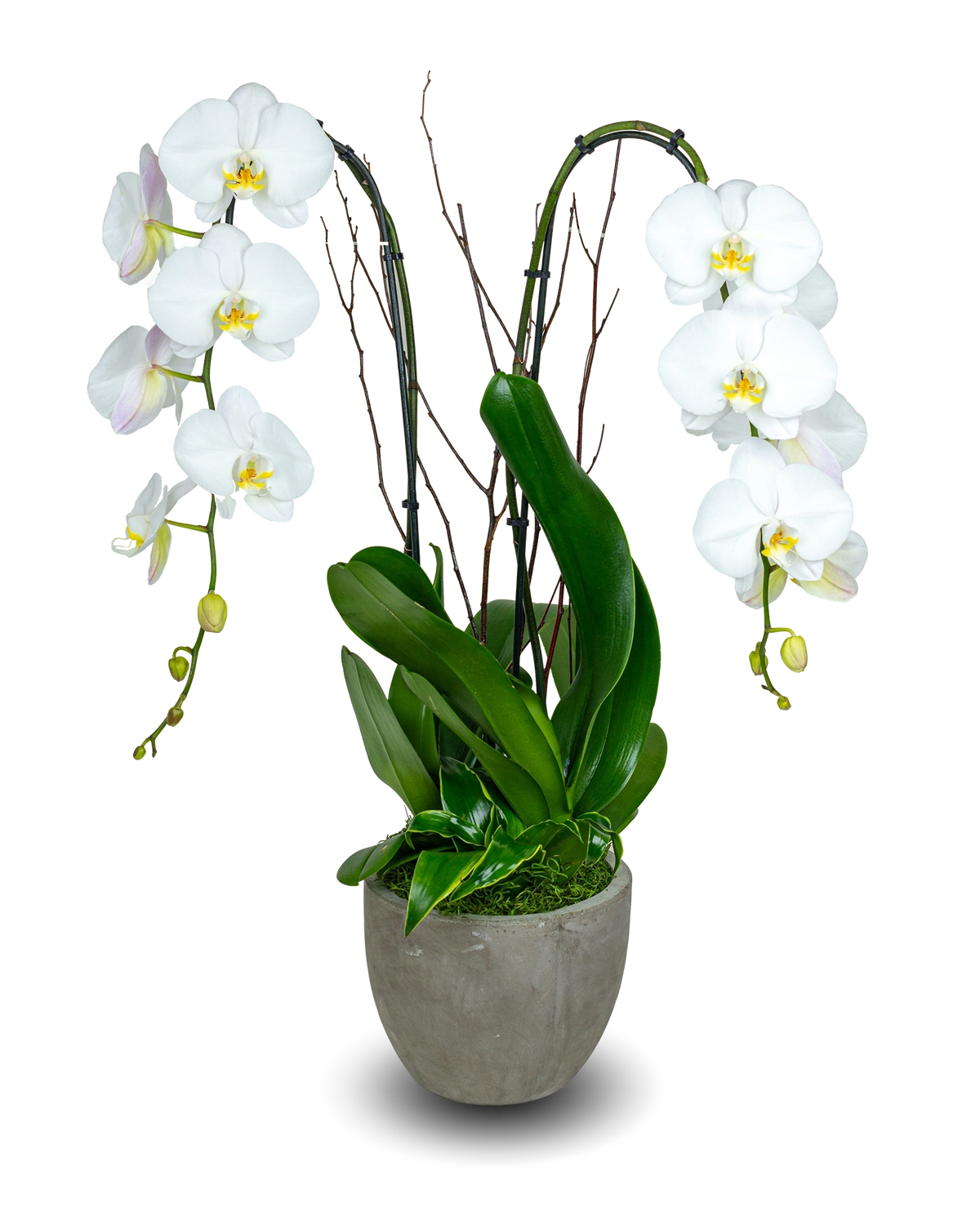 Two natural white phalaenopsis orchid plants in a cement vase, with additional decorative dried moss, and dried wood accents. The unique dried accents of this arrangement enhance the natural colors of the plant, a simple and classic design perfect for any occasion.