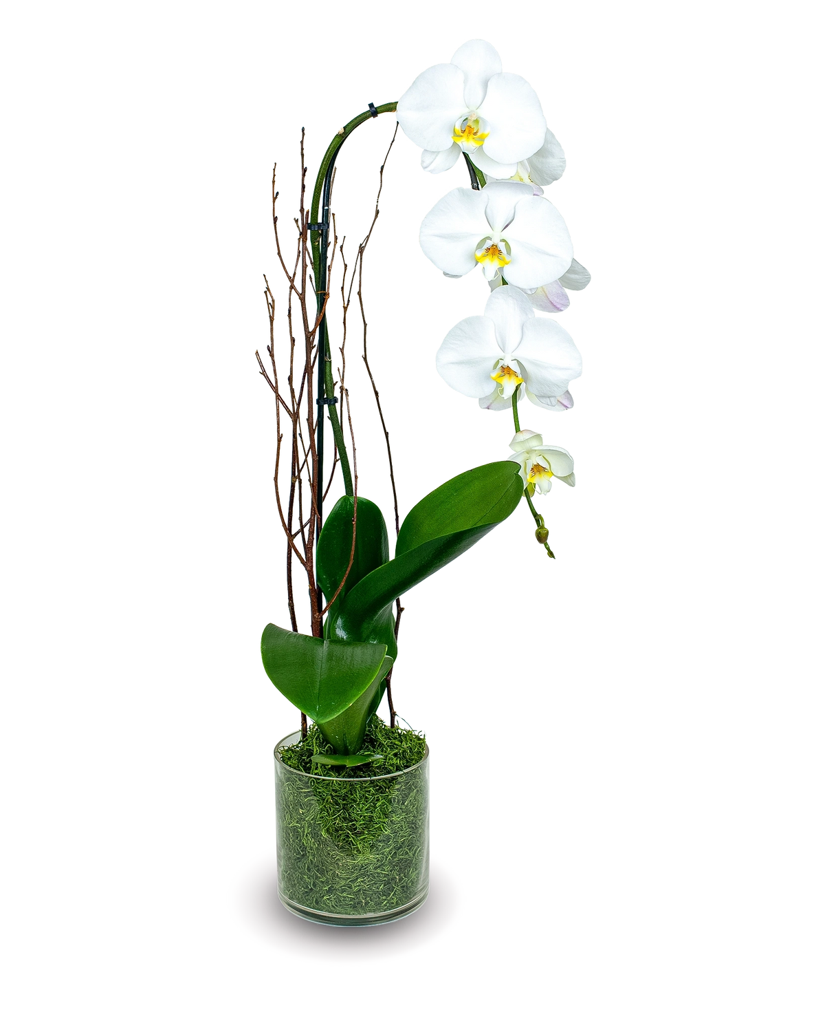 Natural white phalaenopsis orchid plant in a clear glass vase, with additional decorative dried moss, and dried wood accents. The unique dried accents of this arrangement enhance the natural colors of the plant, a simple and classic design perfect for any occasion.